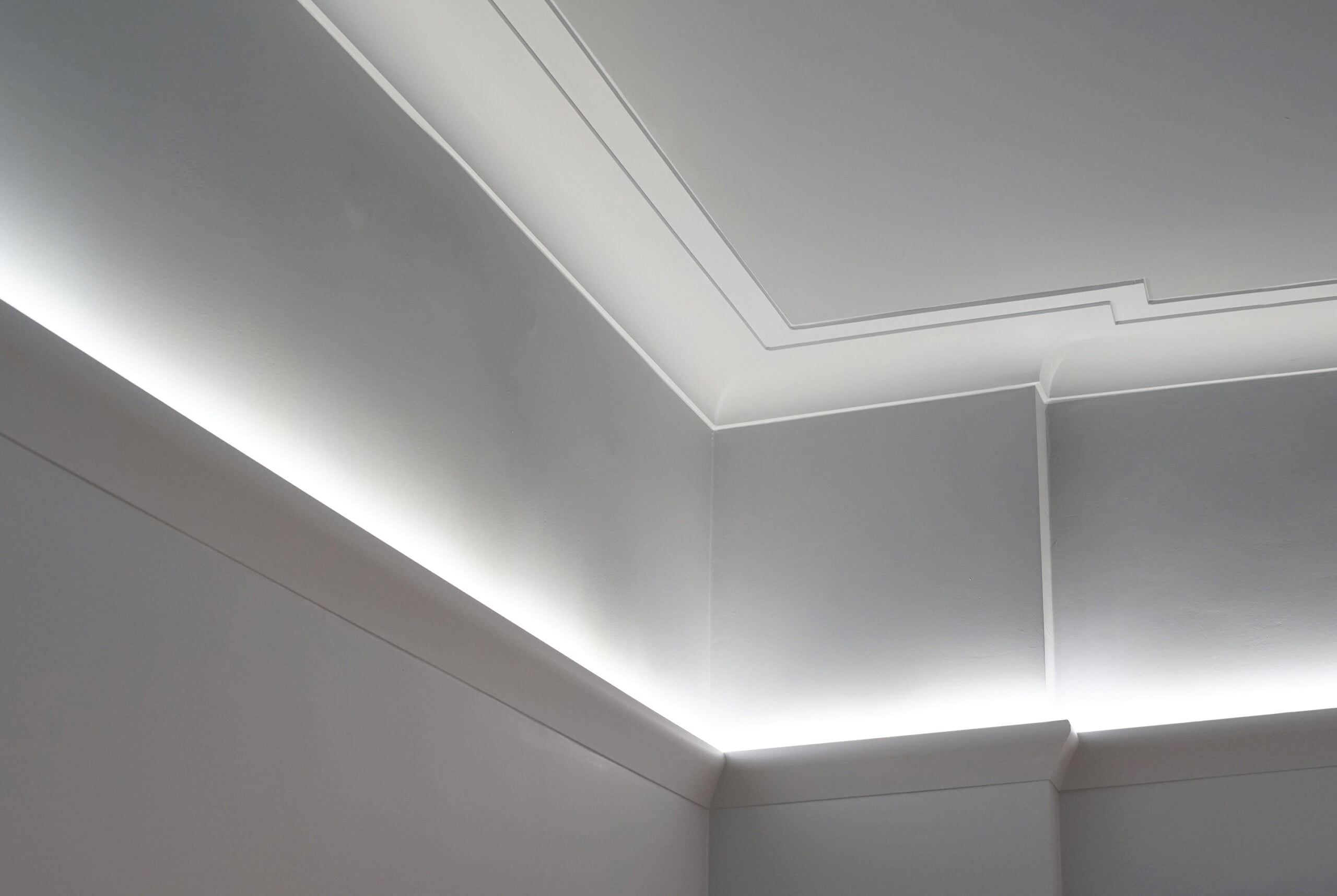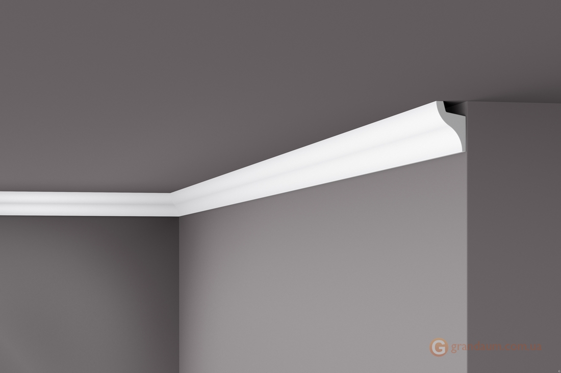 Для скрытого светодиодного освещения за молдингом имеется место для крепления светодиодных лент. В зависимости от положения также может быть место для скрытия небольших проводов и неэстетичной отделки. Карниз поставляется загрунтованным и готовым к покраске. Установка заключается в простом приклеивании карнизов на место.