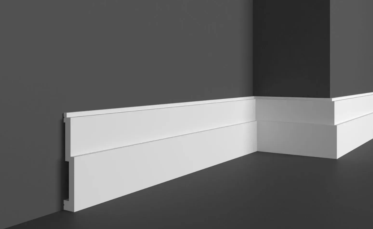 Создайте индивидуальный традиционный интерьер с помощью гладких Напольный плинтусов из полиуретана и дюрополимера. Существуют безграничные идеи и возможности при установке напольных плинтусов для создания уникальных стилей и всевозможных декоративных обрамлений на стенах и потолках. В классических домах, ресторанах и гостиницах гладкие напольные плинтусы добавляют нотку элегантности и классического стиля. В современных интерьерах напольные плинтусы формируют четкие линии, характерные для современного дизайна. Прочный полиуретановый материал защищает от ударов и повреждений. Напольный плинтус производятся гладко загрунтованными и готовыми к покраске.