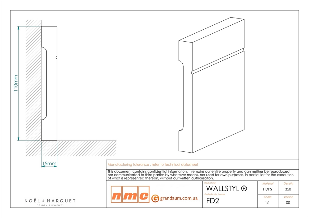 Плинтус FD2 WALLSTYL® поставляется загрунтованным и готовым к покраске, или, при необходимости, молдинги можно заказать с заводской окраской во многие цвета RAL или NCS (при заказе более 500 погонных метров). Дюрополимер HDPS высокой плотности подходит для всех жилых и коммерческих помещений благодаря ударопрочности и водонепроницаемости. Кроме того, молдинги имеют малый вес, поэтому их установка выполняется быстро и точно.