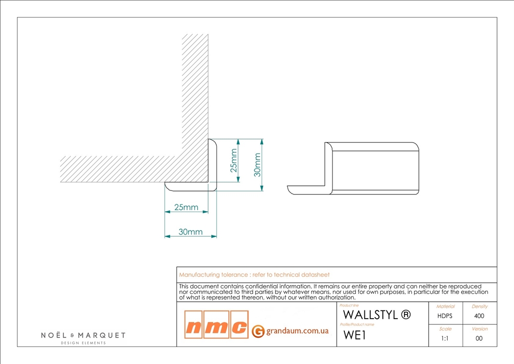 NMC WE1 WALLSTYL® — это декоративный элемент для защиты углов. Простой дизайн делает лепнину универсальной для любого интерьера. WE1 обеспечивает защиту от ударов по углам и потертостей.